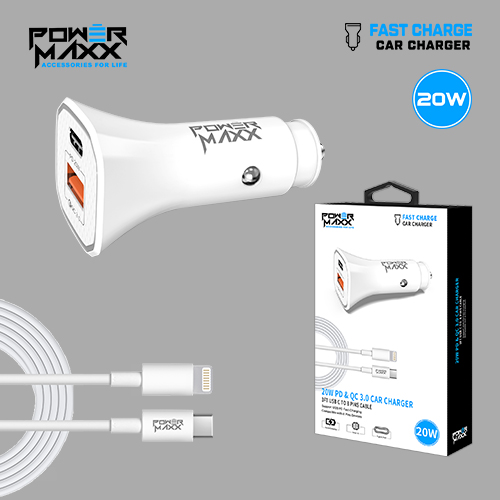 Fast Car Charger 20W PD&QC 3.0 USB WHT w 3ft C to 8Pin Cable
